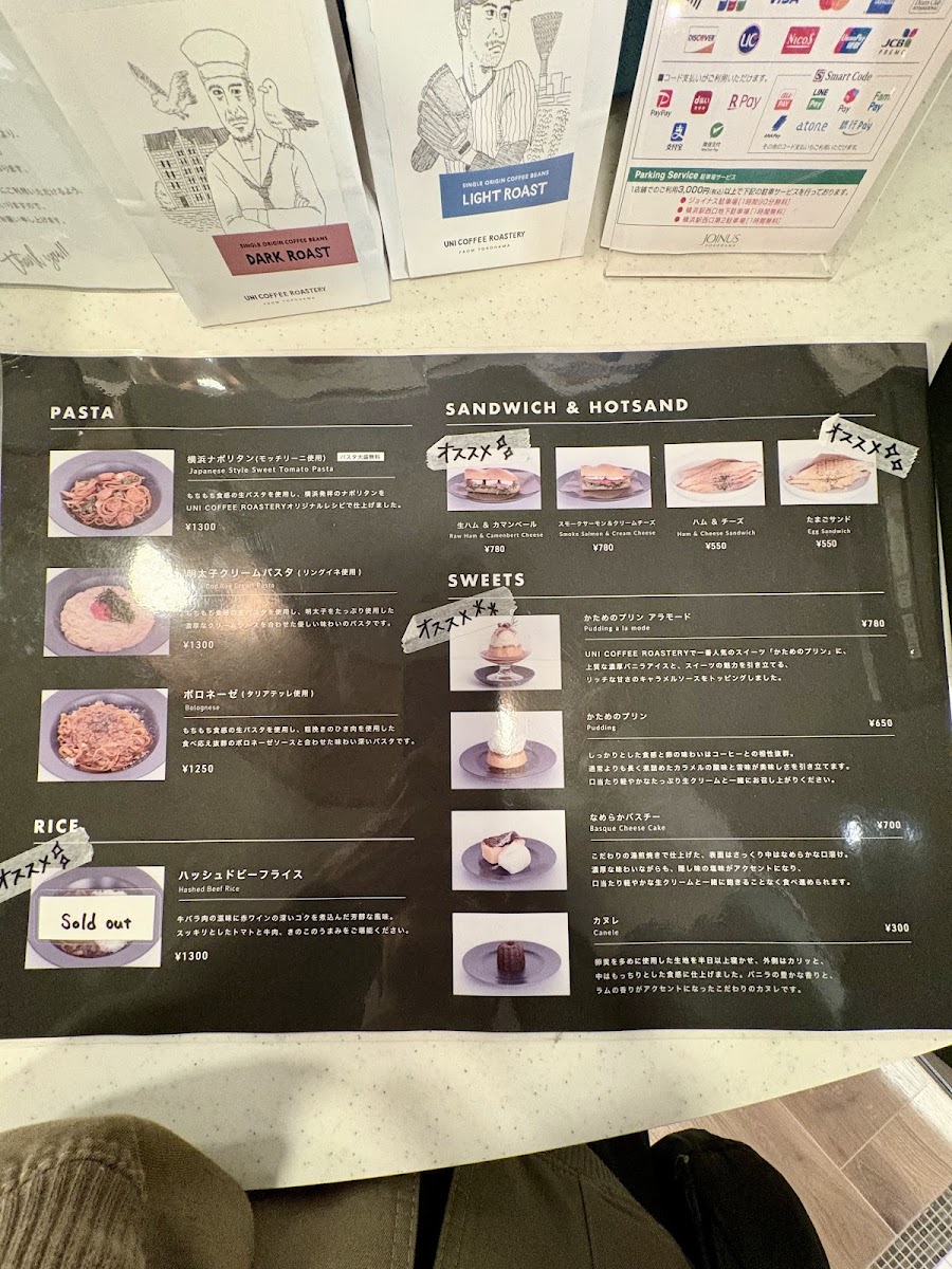 Beyond coffee, the café features a variety of tantalizing food options, including warm sandwiches and savory pasta dishes. The Ham & Cheese Hot Sandwich (JP¥570) and Egg Hot Sandwich (JP¥570) are perfect for a quick bite, while the Serrano Ham & Camembert Cheese Sandwich (JP¥790) promises a gourmet experience that will leave your taste buds dancing.